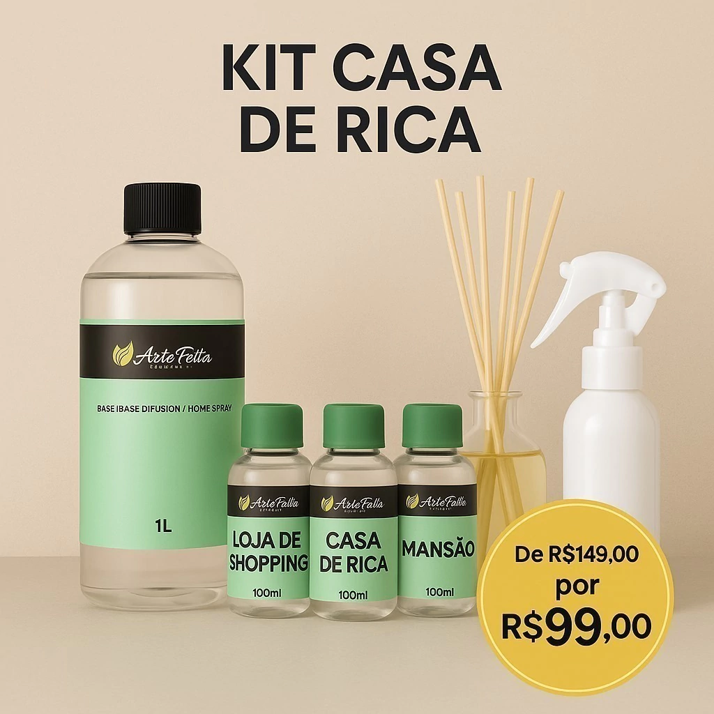 Contém Base para Difusor 1L + 3 Essências POP 100ml + Frasco de Vidro com tampa e varetas + Frasco Pet com válvula spray
