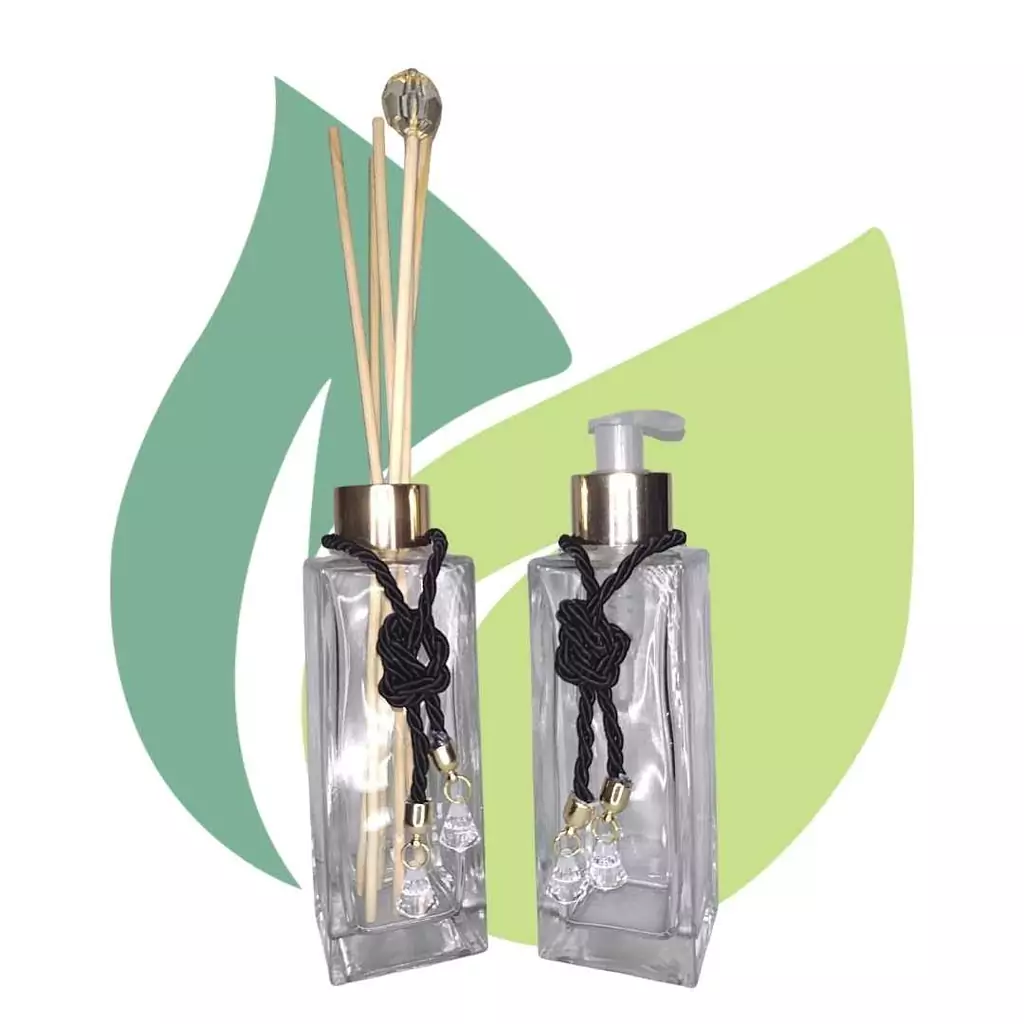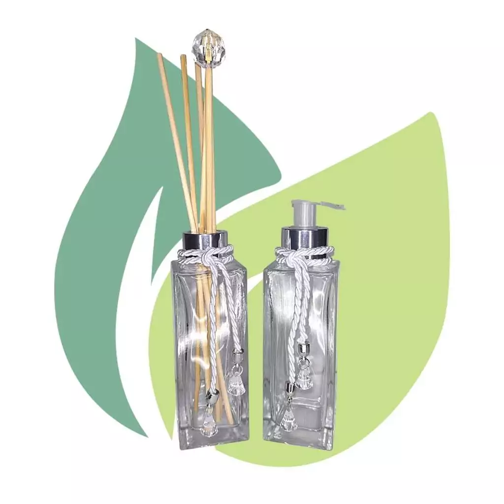 Contém: Vidro retangular transparente, varetas lisa de bambu, vareta decorativa, pingente decorativo, tampa para difusor e válvula bico de pato tipo saboneteira (pump - dispenser para sabonete líquido).