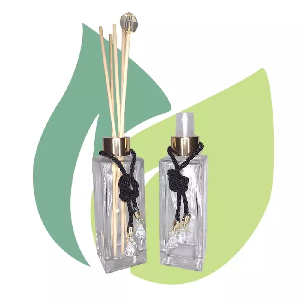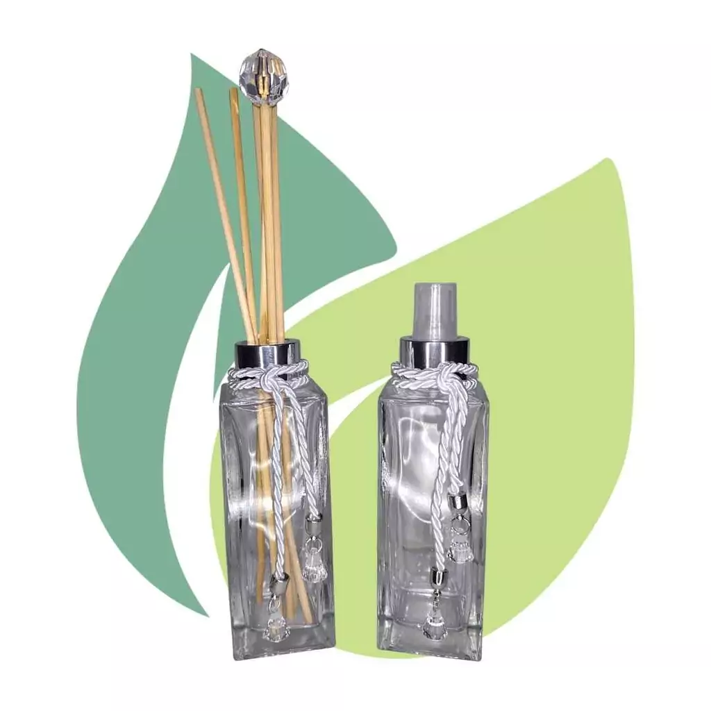 Contém: Vidro retangular transparente, varetas lisa de bambu, vareta decorativa, pingente decorativo, tampa para difusor e tampa spray.